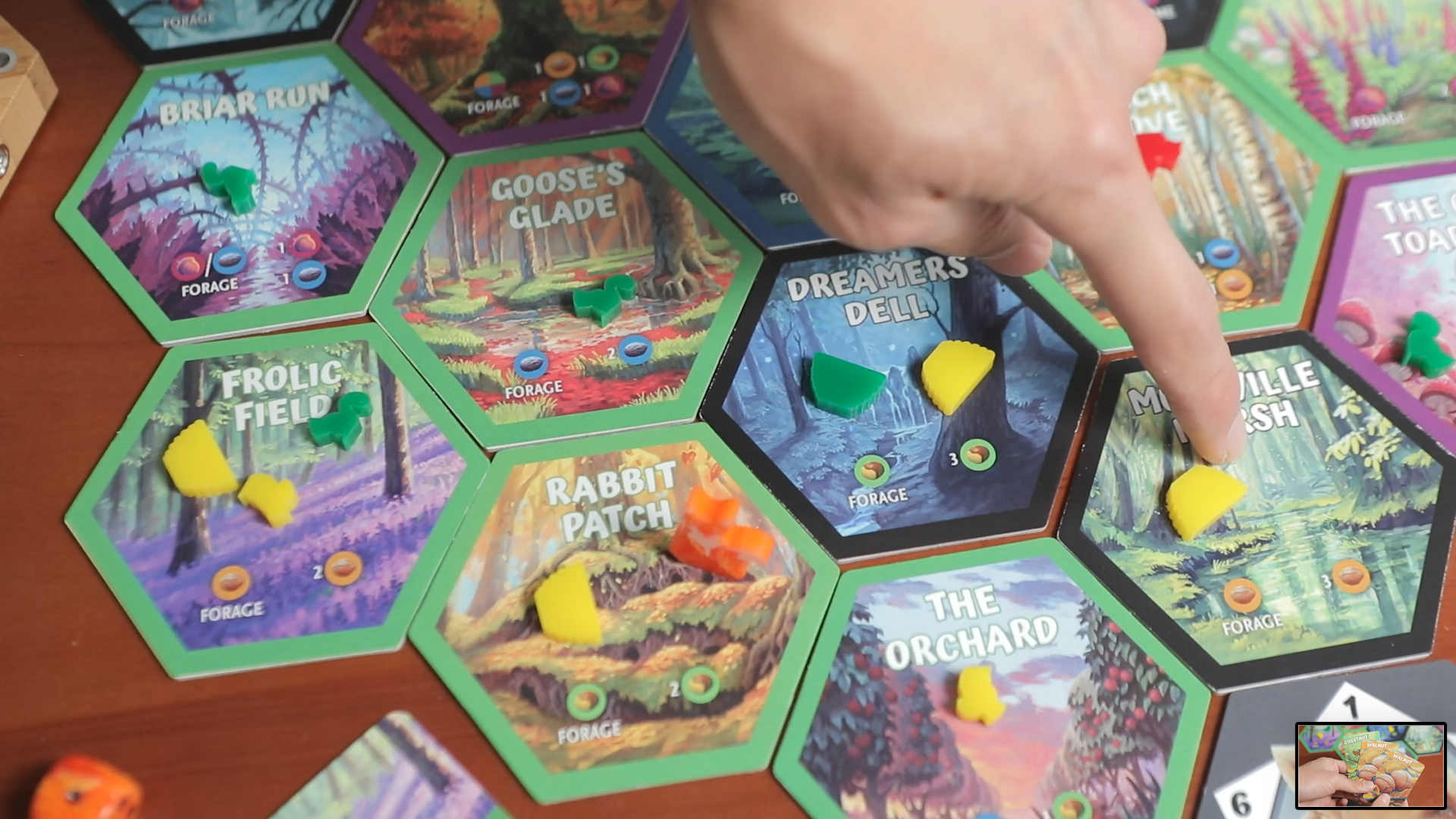 Nut Hunt has the same graphic artist as Scythe and Wingspan, with lots of texture and different types of hexes to start pulling you into this fantasy forest land. There’s a “Froggy Pond”, or the “Giant Toadstool” for your Squirrels to hang out in. Nut cards are also super distinct.
